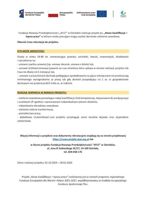 Fundacja Rozwoju Przedsiębiorczości "ATUT" w Ostródzie realizuje projekt pn. "Nowe kwalifikacje = lepsza pracy" w którym osoby pracujące mogą uzyskać darmowe szkolenia zawodowe. Szczegóły w linku: https://nowe.projekt.atut.org.pl/